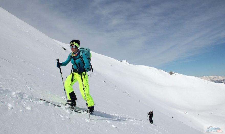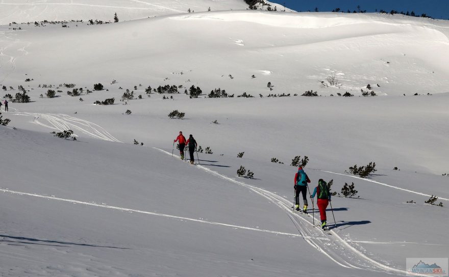 Na krátkém úseku může sklon svahu přesáhnout i 40 stupňů, ale obecně se jedná o pohodové sjezdy vhodné i pro úplné začátečníky. Zadobrých sněhových podmínek je možné i během slunečného víkendu najít nerozježděný svah. Planinou pod svahem přejíždíme k řídkému lesu, kterým jsme sem nastoupali. V lese jsou opět mírnější i strmější úseky. Nejedeme po výstupové stopě, ale směřujeme přímo na sever kousek západně od výstupové stopy. Takto na lyžích dojedeme až k parkovišti.