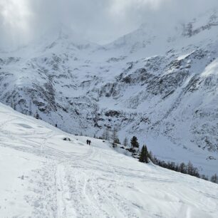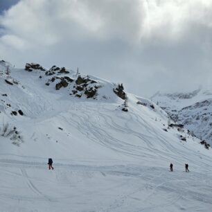Od mezistanice lanovky přecházíme nad hranou černé sjezdovky S5 k začátku fitness skialpové túry na Kreuzkogel. Vlevo os modře a červeně označené sjezdovky S1 je rolbou upravený výstupový pás. Po úvodním krátkém výstupu přímo na sever stojí za malou odbočku vyhlídkové místo nad údolím s několika skalkami a kameny.