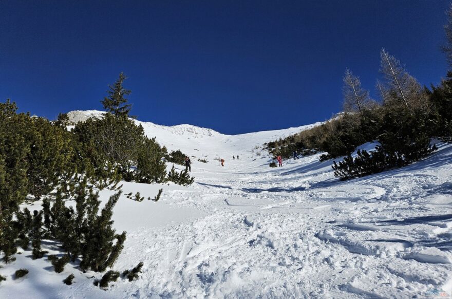 Níže to můžou být i větší traverzy, které výše zkracujeme. Umístění ski depotu záleží také na množství sněhu. V lednu 2025 bylo sněhu méně, a proto byl v 2100 metrech. Za drobých sněhových podmínek je možné začít sjezd kousek pod předvrcholem Lugauer Plan (2160 m). Ze skidepotu pokračujeme pěšky a podle podkladu je vhodné použít stoupací železa, případně i cepín. Z Lugauer Planu je hřebenovka k vrcholovému kříži na Lugaueru (2217 m) místy úzká a exponovaná, a vede přes další nevýrazný vrcholek.
