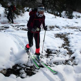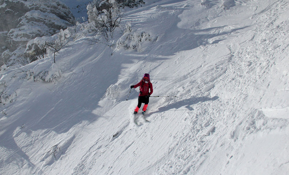 Po odborné prohlídce vrcholku a jeho sjezdových možností se vydáváme dolů jedinou sjízdnou trasou. Ledovato naštěstí není, ale neprorážíme ani metrový prašan. Na povrchu je tužší krusta a pod ní měkko, takže žádná tragédie, sekáme a proplouváme zúžujícím se žlabem do nižších poloh. Mezi lesním freerajdováním protínáme cesty v traverzech, až se po překonání bublajících kamenitých potůčků dostáváme na finální spodní cestu.