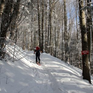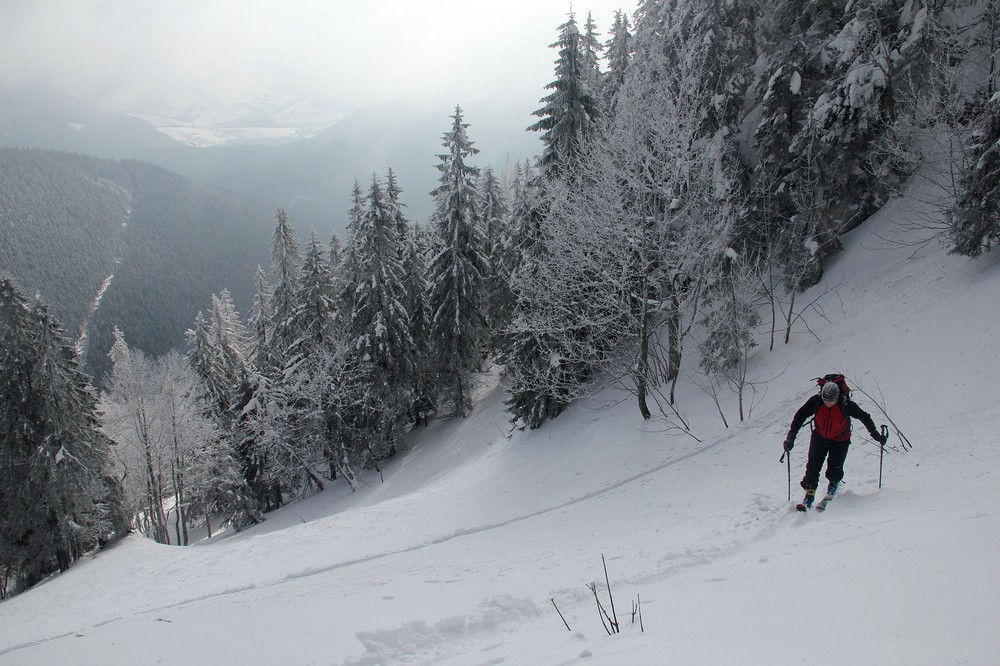 Stoupání po červené ubíhá rychle, z méně zasněžených lesů se přesouváme do vyšších poloh (1100 m) s hromadami prachového sněhu a ledovým vichrem z hor. Začínáme nabalovat vrstvy oblečení, terén nabývá na vertikalitě. Místy je lepší “cikcakovat” anebo se nechávat fackovat smrkovými větvemi. Těsně pod sedlem Vráca (rozdělující Malý Choč a Velký Choč) není zbytí a lyže rovnou sundáváme.