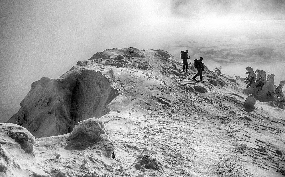 Od sedla Vráca už se terén otvírá, stejně jako výhledy prostupující trhající se mlhovinou. Tady už šlapeme hřebenovku mezi osamocenými postavami stromů, které sníh a led pokryly do bílých rakví. Prošlapáváme stopu závějemi a obcházíme skaliska. Na východní straně tvoří bezedné srázy s sněhovými převějemi rozličných tvarů. Užíváme si výhledy na Západní Tatry, Nízké Tatry, Velkou a Malou Fatru a kdyby se mraky ještě vice protrhaly, určitě i Babí horu.