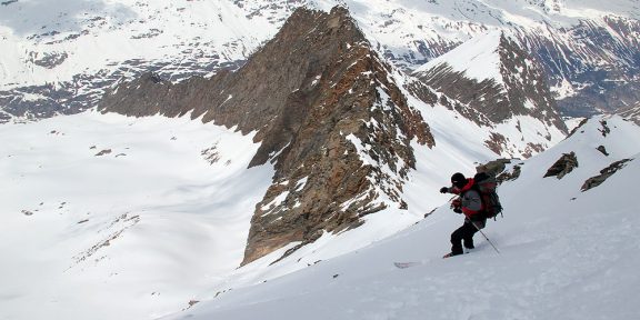 Následný sjezd po ledovci Hangerer Ferner neměl chybu. Níže sníh začal významně měknout, stejně jako rostl počet samovolných standardních a samovolných lavin. Původní cesta na dno údolí se ukázala vzhledem ke skalním prahům jako nereálná. Hynek si to vylepšil o malý pád do žlabu zakončeného skalním prahem, kde dle vlastních slov může děkovat pouze sichrákům, že mu zůstala jedna lyže v dosahu. Jinak by ji hledal o hodně níže a dál někde pod skalami. Museli jsme znovu nasadit pásy, a přesunout se o kus výše. Sjezd v měkkém mokrém sněhu byl dost náročný až po další skalní prahy. Tady začalo různé proplétání po sněhových polích.