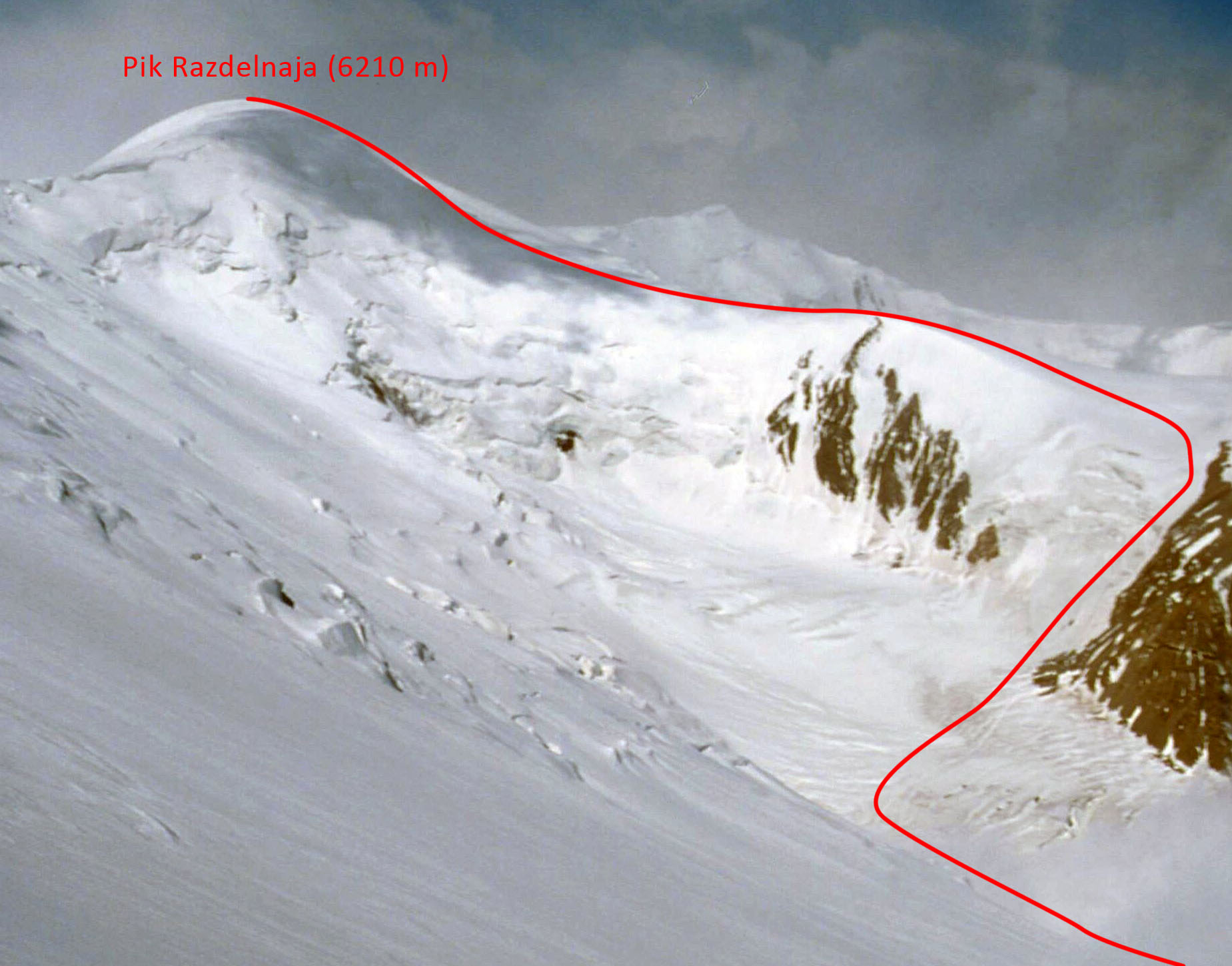 Sjezd z vrcholu Piku Razdělnaja je víceméně po výstupové trase. Je nutné dávat pozor na možnost uvolnění menších deskových lavin a davy pěšáků vystupujících nebo sestupujících vyšlapanou stopou. Z výšky 5800 metrů je sjezd obvykle výborný až do 5500 m. Odtud je někdy problematická pravá část v případě obnažení séraků, v takovém případě je lepší sjíždět podél kamenů až k Camp 2.