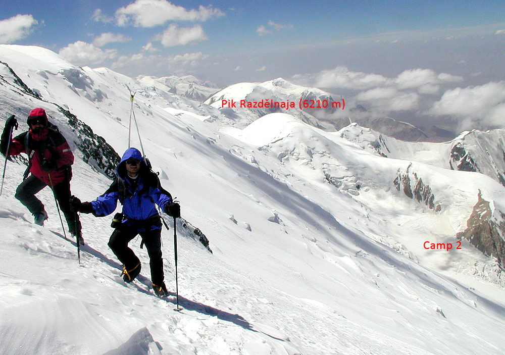 Na lyžích je výstup různě dlouhými traverzy ohraničenými trhlinami a séraky. Po nastoupání do výšky 5200 metrů se stopa stáčí doprava a přes nevýraznou vyvýšeninu začíná dlouhý traverz do údolí pod Pikem Razdělnaja pod séraky spadajícími z vrcholového hřebene Piku Lenina. Denní etapa je potom zakončena mírným výstupem posledních sto výškových metrů k Camp 2 (5300 m). O den později je možné výstup na hřeben (5500 m) zvládnout v závislosti na sněhu přímo nebo traverzováním na lyžích.