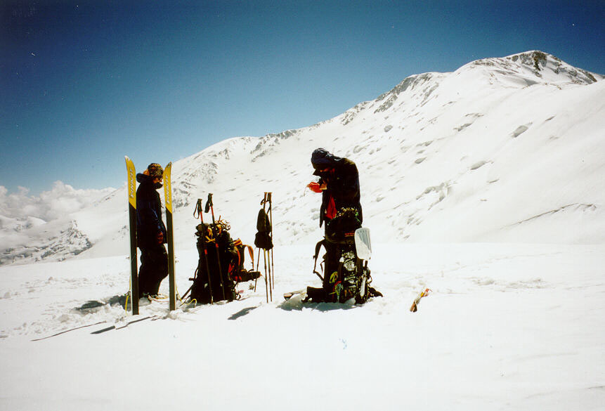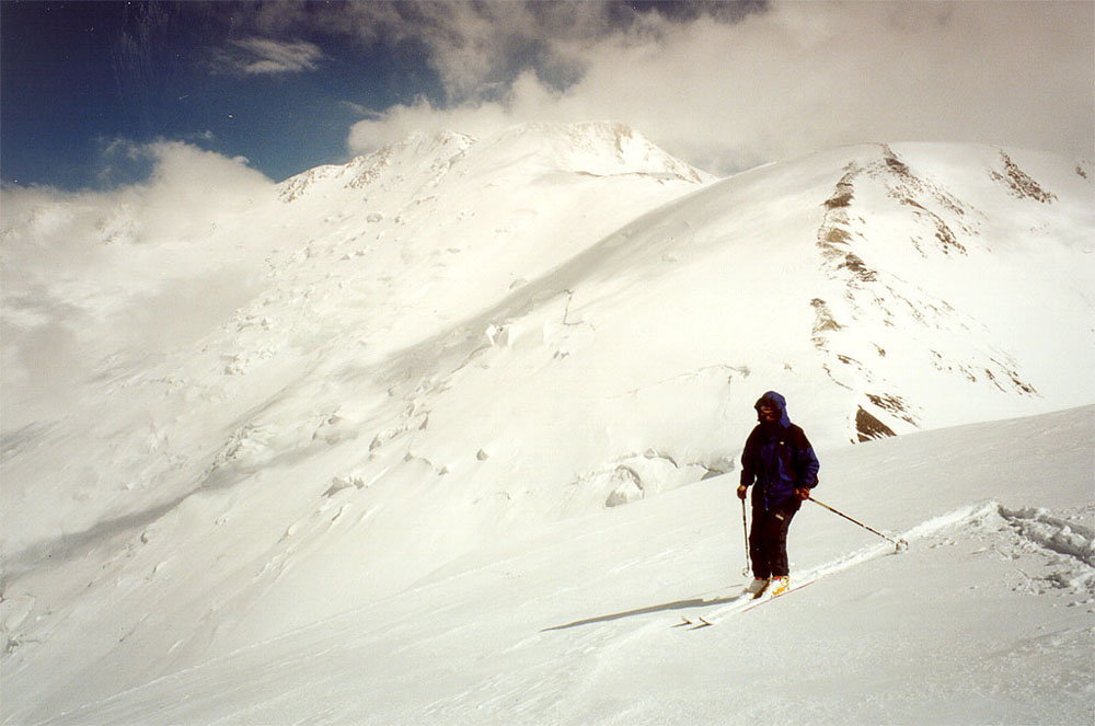 Z hrany hřebene se pokračuje dále mírně stoupajícím terénem do sedla 5800 m, kde se také obvykle lomí počasí. Zatímco do této výšky může být bezvetří a slunečno, odtud silně fouká a počasí se rychle mění. Z výšky 5800 metrů jsou dvě varianty výstupu, stejně jako sjezdu.