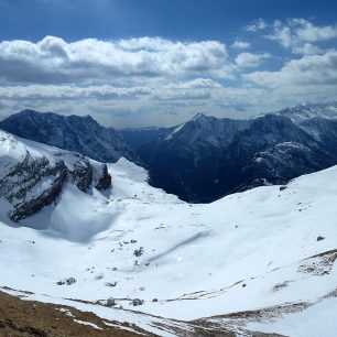 Po překonání tohoto zpestření desetimetrovým lezeckým úsekem, už nás čekalo jen strohé šlapání kolmo vzhůru svahem okolo 40° pod majestátní stěnou Mangartu. Sníh byl ve většině částí výstupu nafoukaný tvrdý a zmrzlý, takže jsme museli celou cestu prošlapávat až nahoru ve stínu masivní stěny. Jelikož stále mrzlo a čím jsme byli výše tím i více foukalo, těšili jsme se nahoru, až nás prohřeje sluníčko.