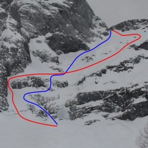Již z dálky bylo vidět, že výstup nám zkomplikuje nástup na úbočí hory, který dělila skalní hrana táhnoucí se podél celého úbočí s mohutně natečeným ledopádem uprostřed. Cesta k ledopádu vedla pohodlně lesem a pláněmi pod horou. Až když jsme se přiblížili pod ledopád, našli jsme si výstupovou linii, která však obnášela výstup na botách s lyžemi na zádech, pro větší jistotu jsme použili i mačky a cepín. Po pár nastoupených metrech se naše skupinka ještě rozdělila, když se ukázalo, jaká cesta nás čeká nahoru. Větší část dala nad ledopádem přednost využití dobrého počasí vychutnání si sjezdu přímým směrem k jezeru. Naše trojice si zvolila výlez přes skály, kde bylo zapotřebí i trošku lezeckých schopností.