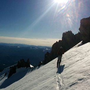 Vstali jsme kolem deváté ráno a kolem nás byly spousty lidí – nasazovali stoupací pásy, obouvali si sněžnice, startovali skútry, případně zrovna přijíždějící hledali místo k zaparkování. Po rychlé snídani a krátkém rozhovoru s lidmi ze Santa Cruz, jsme vyrazili na pásech pod pálícím sluncem jezeru Helen (které už není jezerem), které je pod nejoblíbenější a nejjednodušší cestou na vrchol – Avalanch Gulch. Stoupání je velmi jednoduché – sledujeme spousty lyžařských stop do doliny mezi dvěma hřebeny – Green Butte napravo a Casaval Ridge nalevo.