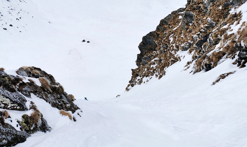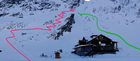 Pro sjezd jsme vyhodnotili tři možnosti. Středem, nebo hodně doleva a pak to pustit nebo hodně doprava, nad ledovcem a skončit u jezera. Každý z nás jel dolů jinudy. Ze začátku je svah strmý kolem 50° takže zde není moc prostorou točit, sníh byl navíc přemrzlý. V polovině sjezdu se svah mírní na 35° a dojet se dá opět až do půlky jezera, či k parkovišti po levé ruce. Záleží, kam směřuje váš další výlet. V cestě nejsou žádné skály, jen pár zlomů, za kterými se vám druhý ztrácí. Nad jezerem pak přejíždíme i ledovec