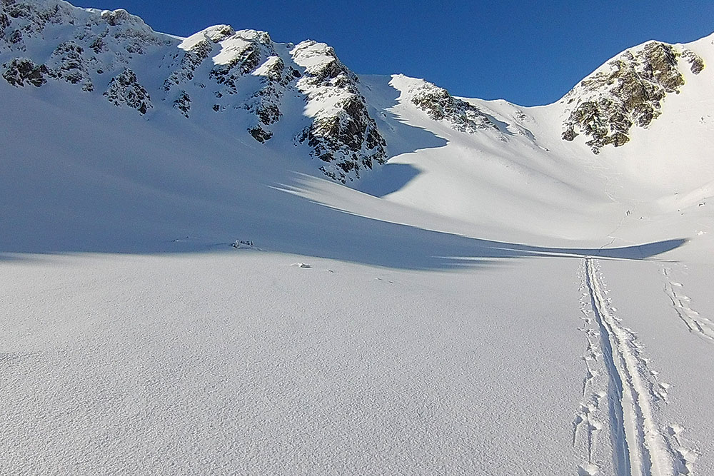 Samotný sjezd výstupovým sedlem je nenáročný – ideální pro začínající skialpinisty, pro zkušenější se nabízí sjezdy žlaby dle aktuálních sněhových podmínek. Pro druhý a další sjezd jsou za vhodných sněhových podmínek doporučitelné žlaby ze severozápadního vrcholu Salatína. Je jich několik vedle sebe a sklon se pohybuje v rozmezí přibližně 35 až 45 stupňů. Horní hranice strmosti se mění v závislosti na sněhových podmínkách.