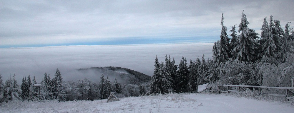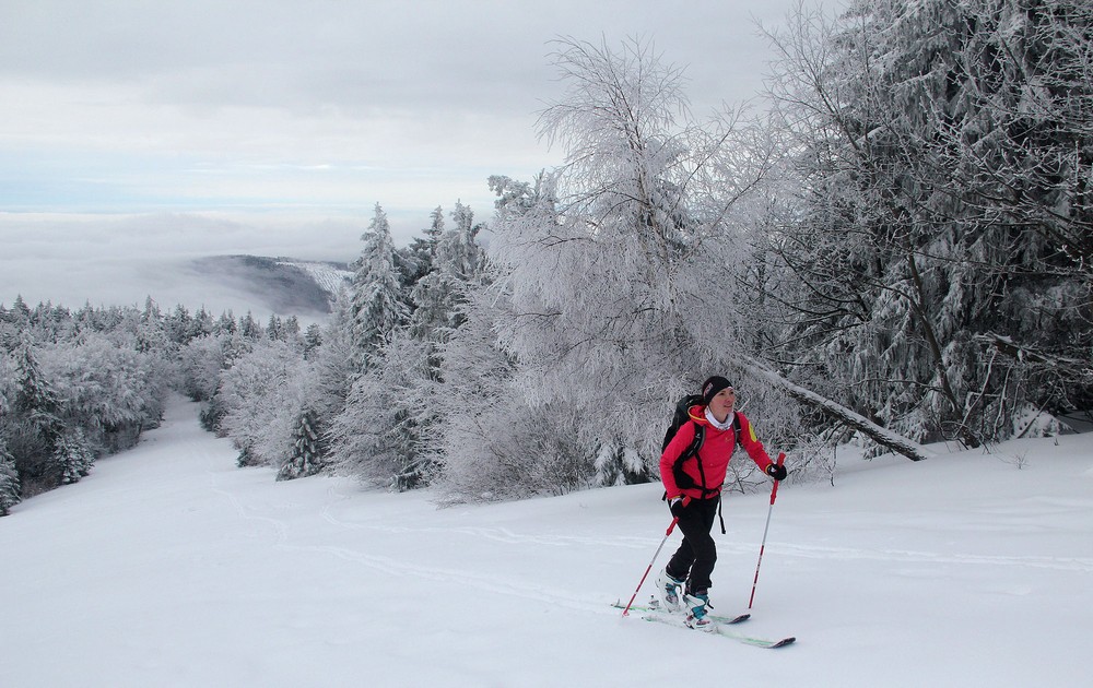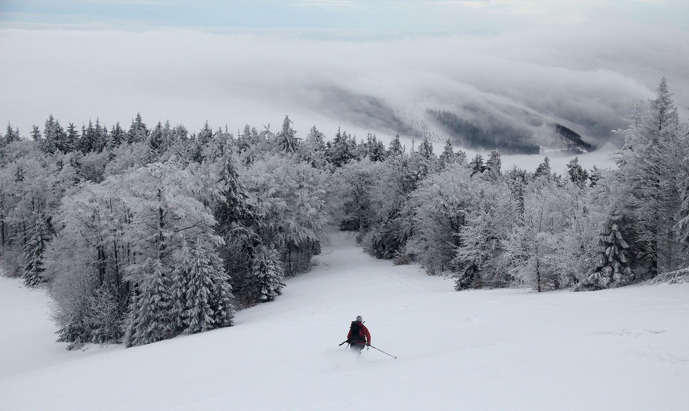 Tulení pásy jsme sice sundali přímo u kaple na vrcholu Radhoště, ale přímé okolí bylo silným větrem poněkud vyfoukáno na kamenný podklad lehce pokrytý sněhem. Prvních pár metrů jsme tak opatrně sešlapali, abychom se vyhli novým zářezům od skluznic lyží. První sjezdový úsek vede po modré sjezdovce, která není na začátku sezóny upravená, takže se jedná o „freeride“. Sjezdovka vede na západ, následuje průjezd hřebenovým lesem na louku na Velké Polaně (981 m) s následným stočenm na jih na Černou horu. Místy ještě chybí dostatečné množství sněhu, takže část sjezdu scházíme pěšky.