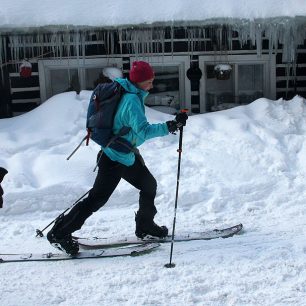 Pokračovali jsme dále s nepatrným převýšením k Boudě pod Sněžkou, kde končí prohrnutá cesta. Dále už je jen pěkná skialpová stopa. Těsně před námi jdou dva skialpinisté a před nimi podle stop ještě opěšalí turisté. Nechápeme, že v takovém množství čerstvého sněhu, z něhož je většina prachová, se chce někomu šlapat pěšky.