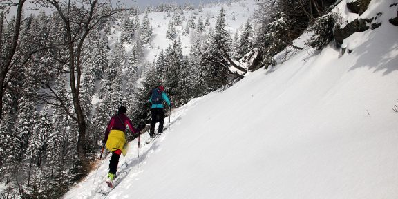 U bývalé kovárny (1025 m) poprvé zatáčíme na opačnou stranu traverzu a sklon se příjemně zvětšuje. Strmějším svahem s různě hustým lesním porostem traverzujeme k zářezu Rudného potoka. V zářezu (1225 m) je velké množství sněhu, takže se ani nedá odhadnout, kde se vůbec nacházejí v létě jasně patrné vodopády Rudného potoka.