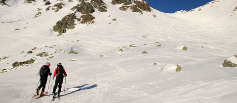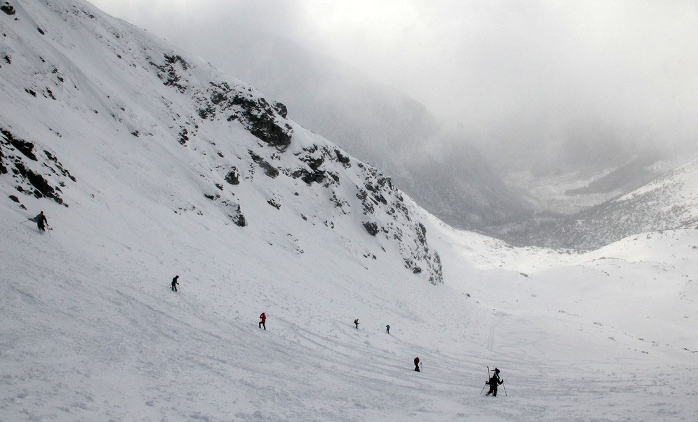 V kotli se stáčíme vpravo, buď využijeme některou ze starších stop, nebo vhodně zvolíme vlastní směr výstupu. Rychle nabíráme výškové metry. Dostáváme se k závěrečnému stoupání do sedla, kde je nutné opět postupovat vzhledem ke sklonu svahu různě dlouhými traverzy. Není neobvyklé, když na tvrdém a zledovatělém sněhu je závěrečná část výstupu pěšky s lyžemi na zádech. Ze Smutného sedla jsou za krásného počasí krásné výhledy na severní i jižní část od hlavního hřebene.