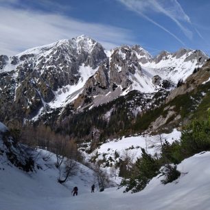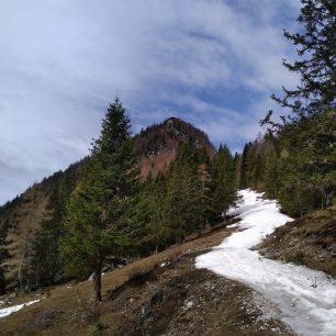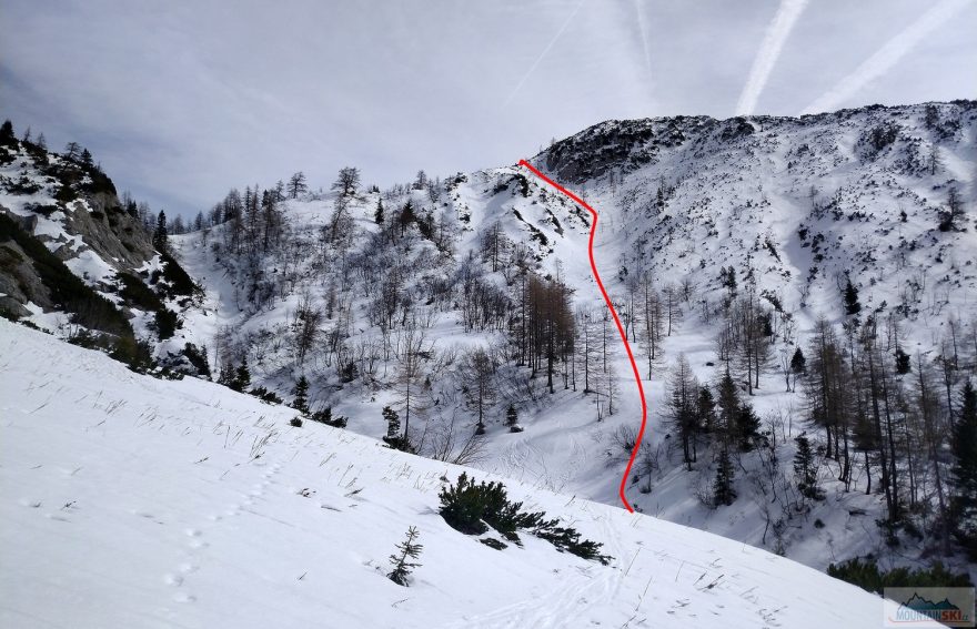 Stoupáme přímo po spádnici východním směrem až se před námi objeví Koča Vrtača, což je bývalá mezistanice lanovky. Podle stavu sněhu a lavinového nebezpečí odbočíme před kočou na sever a nastoupáme necelých sto výškových metrů na cestu lesem stáčející se zpět k západu. Pozor, i když jsme v lese, mohou zde padat laviny!