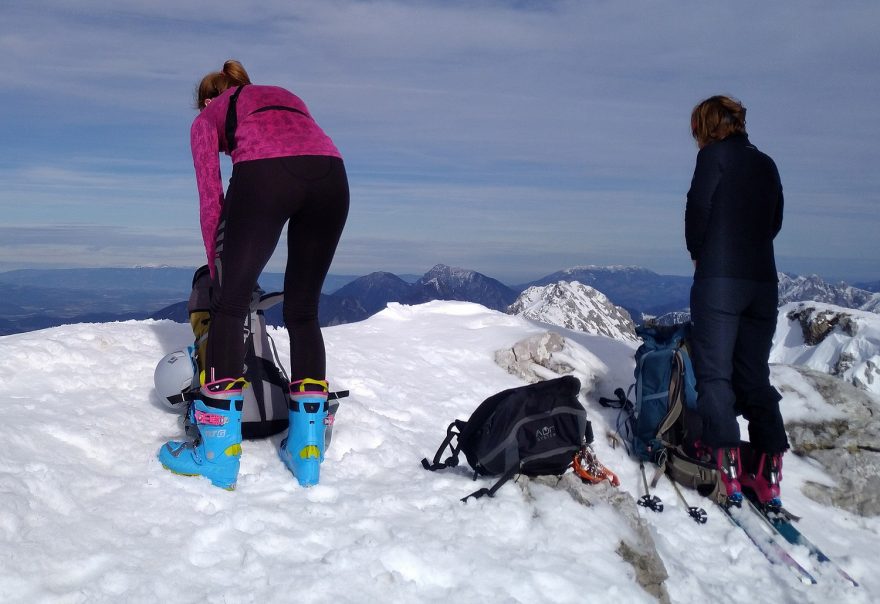 Po dostatečném vynadívání se na všechny světové strany z vrcholu Stolu začneme sjezd, který z větší části kopíruje výstupovou trasu. Nejstrmější část je pod Orličje, kde si každý volí vlastní sjezdovou stopu. To samé platí níže v dolině, která je dostatečně široká na to, aby si v menší skupince skialpinistů mohl každý vykroužit vlastní stopu. Níže nás čeká traverz pod sedlo Šija a výstup na něj. Ze sedla pokračujeme ve sjezdu k chatě Dom pri izviru Završnice. U chaty naposledy nasazujeme tulení pásy, abychom vystoupali do 1550 metrů.
