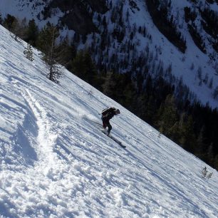 Žleb stoupá strmě 600 výškových metrů, a lehce se stáčí. Z vrcholu volíme sjezd stejnou cestou severním žlabem ve sklonu lehce nad 45 stupňů, výživný díky několika zúženými místy. Na pohodu je naše taktika. Telemarkuji.