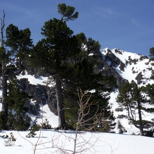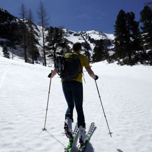 Začínáme od loučky hned nad příjezdovým parkovištěm Jansenberger ve výšce 1230 metrů. Lyže přenášíme asi třikrát po lesní cestě. Dřívější starší firnový základ od výšky 1400 metrů je už plně dostačující. Dostáváme se nad smrky do stráně porostlé snad nejseverněji doloženým výskytem přímořské borovice Limby.
