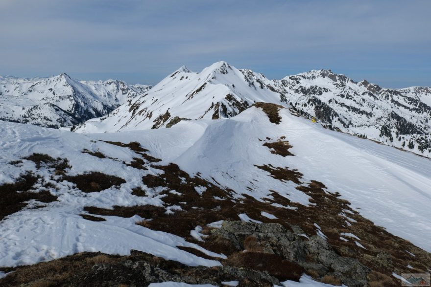 Jediné problémové místo může být v závěrečném úseku výstupu na hřeben. Mám širší lyže (100 mm pod vázáním) a ráno byl v těchto místech sníh úplně zmrzlý. Nahoru mi to dost klouzalo, což se mi opravdu nelíbilo. V závěrečné strmější části výstupu jsem dostala zásek, kdy jsem se měla otočit, ale nedokázala jsem to. Musela jsem si vypnout lyže a po schůdkách, které mi táta ochotně vyšlapal, vyjít po svahu nahoru na hřeben. Táta mi vzal i lyže, aby se mi líp šlo. Nahoře už se všichni kochali krásnými výhledy na okolí a vydechovali.