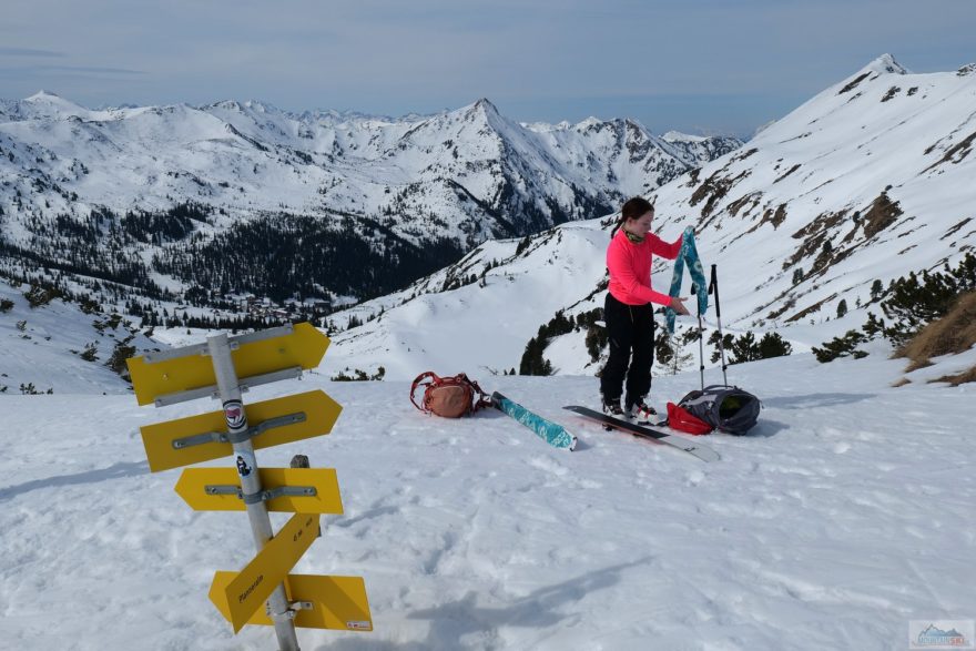 S lyžemi docházíme na kraj sjezdovky pod dolní stanici sedačkové lanovky Plannereckbahn. U sněhu nasazujeme tulení pásy a vyrazili jsme na cestu. Nejprve jsme si zkontrolovali, zda fungují lavinové vyhledávače. Po sjezdovce jsme jenom obešli restauraci Seekaralm (tam jsme potom skončili) a stoupali jsme nalevo od sjezdovky. I když byla polovina března, tak bylo víc teplo, než jsme čekali.