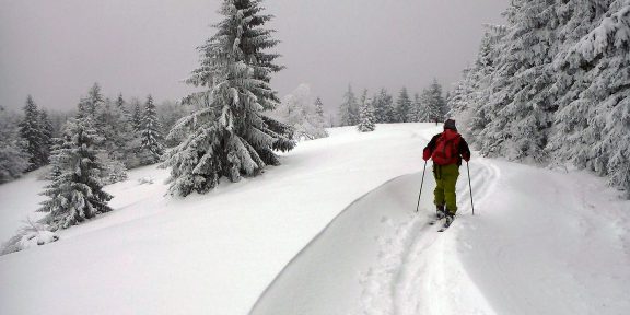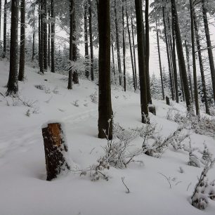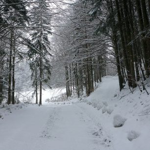 Každopádně jen do první pravé zatáčky, kde žlutou značku nadobro opustíme. Zprvu je cesta jen takový neznatelný průsek v lese, ale po 300 metrech začíná lesní cesta. Tou, nebo podél ní řídkým lesem sjíždíme jeden a půl kilometru parádním sjezdem přes spodní louky až k autu. Skoro k autu, neboť posledních 150 metrů musíme opět došlapat po cestě.