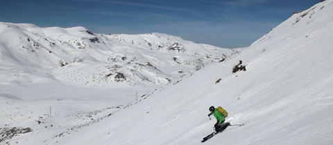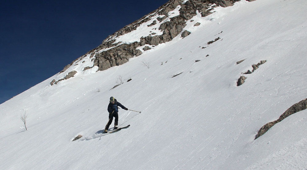 Z vrcholu je samozřejmě několik variant sjezdů. Pro pozdější návrat do Mavrova posléze využijeme pláň přecházející ve sjezdovku. Základní zajímavý sjezd začíná objetím skalního masívu pod vrcholem (viz nákres sjezdu ve fotce) a následně nepřerušovaně svahem o stálem sklonu až do údolí. Alternativou může být najetí do terénního zářezu v horní třetině sjezdu (ve fotce uprostřed) a dojezd mezi keříky do údolí.