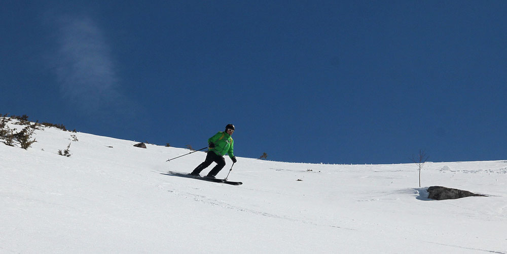 Z vrcholu a ze skály není na začátek sjezdu dobře vidět. Po objetí skály se otevírá pohled do údolí s dlouhým krásným svahem. Po počátečních obloucích na zjištění kvality sněhu to rozjíždíme čím dál tím vyšší rychlosti středními oblouky v co nejsymetričtějším provedení.