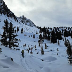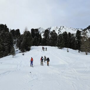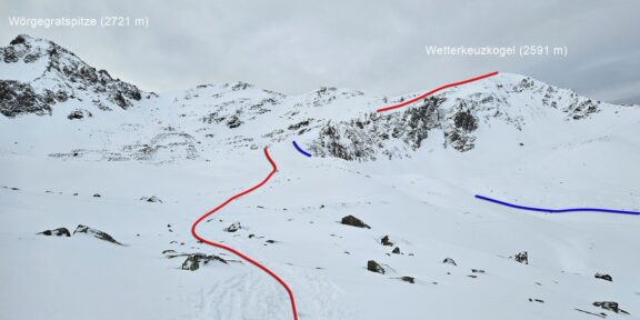 Od planiny mírně stoupáme řídkým lesním porostem do cca 2000 metrů nad mořem. Odtud se nabízí dvě varianty pokračování: 1) kratší kopírující i sjezdovou trasu, 2) delší obcházející dolinu traverzem. Vybíráme si delší varianty pokračující pod hřebenem od Schafzöllen (2399 m) směrem na jih pod Vordere Karlespitze (2574 m), Hintere Karlespitze (2641 m) až pod nejvyšší Wörgegratspitze (2721 m). Tato varianta je krásná vyhlídková a zároveň je výrazně méně využívaná oproti nejkratší variantě dolinou.
