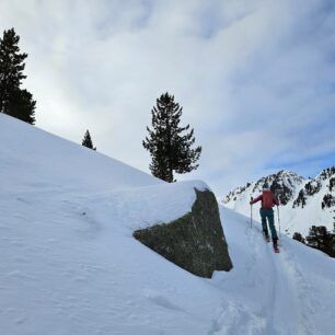 Další krásný prašan je na východně orientovaných svazích z výšky asi 2200 metrů. Níže přejíždíme přes potok Wörgetalbach a napojujeme se na skialpovou dálnici. Projíždíme kolem Knappenhausu se zamrznutým vodním kolem a mírným svahem dojíždíme k Hüttenwerk Wörgetal. Odtud začíná lesní úsek, který za vysoké sněhové pokrývky může být parádní, ale v lednu 2025 tady moc sněhu nebylo. Sjezd tak byl velmi zábavný přes vyježděné muldy, trčící kameny a s vyhýbáním se stromům.