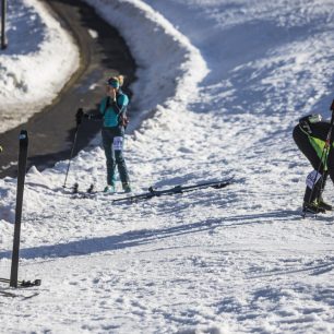 To se mi celkem dařilo až po kraj lesa kdy opouštíme sjezdovku. Pochopil jsem velmi rychle, že musím zvolnit a snažil jsem se jít co nejtechničtěji – úsporně a zároveň co nejrychleji. Při vystoupání na první cestu jsem se udržel čtvrtého závodníka a valím ve vajíčku k dalšímu depu, kde nasazujeme pásy. Lyže mám vzorně připravené a jedou skvěle, takže dojíždím třetího závodníka. Nasazuji pásy a začíná stoupání po turistické cestě na od Papežova.