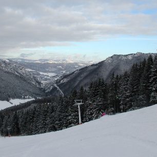 Přejít do galerieNa konci sedačky jsme se počkali, a pár výškových metrů pod chatou jsme přejeli ke sjezdovce vedoucí k Poludňovému grúňu. Už zespodu bylo vidět, že nad hranicí lesa je sníh zfoukaný a je ho málo. Nad hřebenem byla oblačnost, takže jsme se oproti minulému zahájení sezóny v roce 2011 – Matúš ukazuje paličovi tréningový skialpový kopec – Poludňový Grúň (1460 m) rozhodli, že skončíme pod nejužším místem lesního průseku.