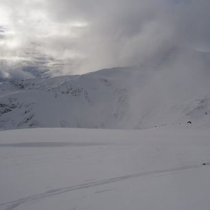 Stoupáme přes vyfoukané ledovaté pole, kde paže bolí – speciálně moje pravá, protože mi chybí na postarší hůlce hrot dole. „Ano, už si opravdu koupím nové hole!“, říkám si. Kopec se zvedá a to už pásy ani paže na ledu nezvládají. Sekce na mačkách je tady.