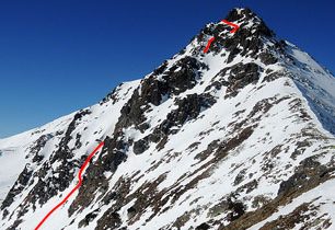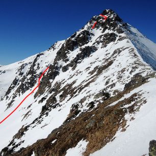 Stoupám širším žlabem doprava od nákresu Miro Peťa, je zde více sněhu, a přes hřebínek se vracím doleva přesně pod krutě strmý a úzký traverz jižní vrcholové rampy. Nebořím se k ní, nýbrž přelezu po skalách na hřeben a po něm a řetězech na východní vrchol. Tady, ve výšce téměř 2 100 m, je ještě příjemný chládek a příjemný krystalický snížek na vrcholové hlavě. Mělo by to jít! Ačkoli mě jímá hrůza z té hlubiny pod lyžemi, a zároveň se těším na okamžik, kdy zacvaknu svoje Scarpy do vázání.