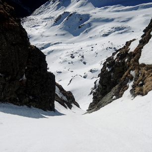 Nad ledopádem sklon stoupá přes 40° a už se to dost boří. Trošku mě mrazí při představě, že by mi to teď nebo později na lyžích ujelo. Pak se kuloárek zužuje a zatáčí doprava za roh mezi mohutné skalní kulisy, nezvykle vysoké na Západní Tatry. Tady je firn akorát, sklon dále stoupá až na 47° a v nejužším místě pomalu uhýbá stín. Lezu pravou ještě zmrzlou stranou a prsty zkouším tvrdost povrchu. Je to dobré, už nyní se špičky prstů proboří horní vrstvou. Trychtýř se nad nejužším skalním prahem, který je na šířku mé krátké lyže, opět rozevírá. Sklon se však stále drží kolem 45°.