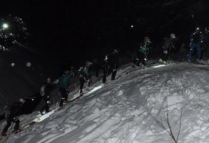 V 16 hodin nahlédneme ve výkladu do útrob trati, včetně výškových profilů a míst, kde všude dnes večer budeme sundávat a nasazovat pásy. Trošku jsem propásla výklad startu a prvního stoupání, ale někdy je lepší nevědět, co nás čeká. Už tak mám na své okolí dost stupidní dotazy, například, co když mi sjede čelovka z helmy, co když mi ujede lyže, kolik si mám nabalit do batohu bund na sjezd, kolik rukavic, kdo vezme termosku s čajem apod. Radek jen kroutí hlavu a čelovku mi zkušeně kurtuje černou lepící páskou.