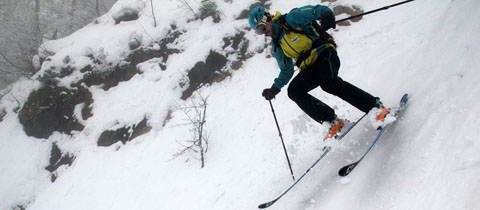 Aby toho nebylo málo, byl to den plný pádů – postupně oba betonáři i já jsme hodili ukázkové tlamy. Napřed Karlovi vypnula spodní lyže, načež to na jedné neustál – zmizel dolů v mlze na zádech a hlavou napřed (odnesl to filtr na foťáku). Poté jsem o něco zachytil já a v různých vzdušných a sněhových kreacích jsem se pustil dole kopcem. Nakonec Martinovi nevyšel přejezd úzké sněhové rampy a pustil to ze skal přímo dolů.