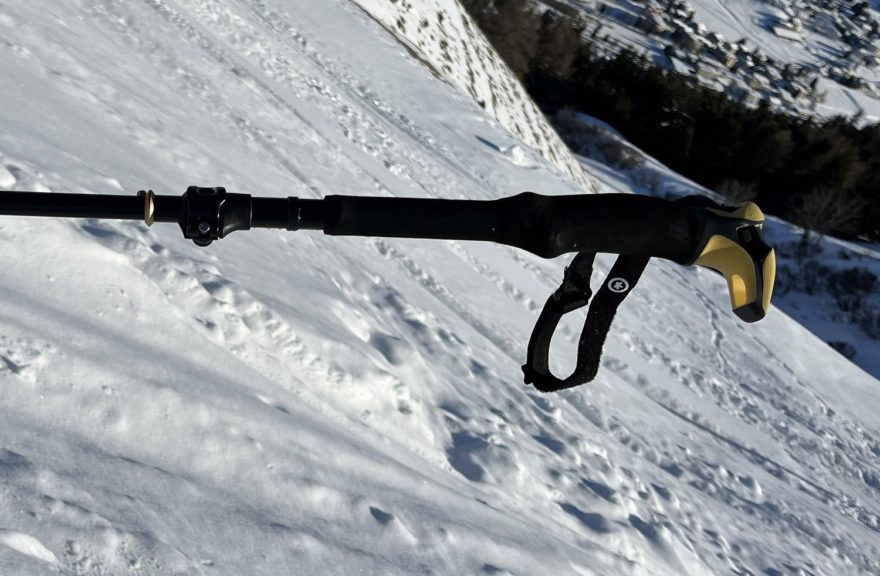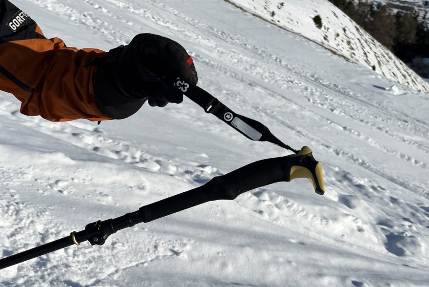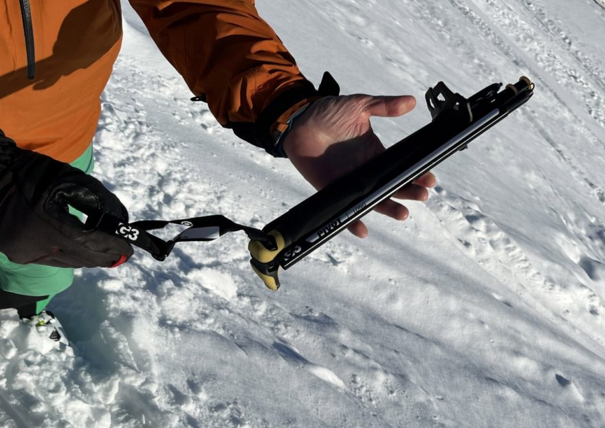 Dvou a třídílných skialpinistických holí je na trhu velké množství. Jejich hlavní nevýhodou pro použití třeba na splitboardu je to, že výrobci nepočítají s tím, že skládací hole by se měly vejít do batohu. Proč? Aby bylo možné je při sjezdu úplně schovat a nemohlo dojít k zachycení za strom, větev nebo o zranění při pádu. Při nástupu v pásmu lesa také může dojít k tomu, že se vícedílné hole někde zachytí. U G3 PIVOT nic takového nehrozí, protože z hole od košíčku po rukojeť částečně vyčnívá pouze jeden zámek pro délkové nastavení v rozmezí 115-135 cm (při testované L verzi).