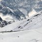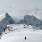 Za námi se vine početný had skialpinistů, kteří vyrazili až po nás. Svah je stále strmější a strmější. V jednom traverzu pode mnou odjíždí kus deskového odtrhu sněhu. Zvyšujeme opatrnost. Paprsky slunce zalily všechny alpské vrcholy široko daleko a my se ocitáme v alpském ráji.