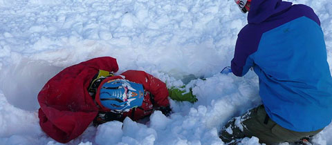Cítím, že se lavina zastavuje, snažím se dýchat pomaleji a s rozvahou a hrabu rukou. Půlka batohu je dolu, a já jsem hlavou po směru laviny. Ven kouká jen bag a jedna ruka. Lavina se temuje, nemůžu opět dýchat tlakem a sněhem v puse. Odhrabávám si pusu a sundavám brýle – nechápu jak se udržely. Jednu ruku mám hluboko pod sebou sundanou na poutku a dost to škrtí. Druhou rukou se snažím odhrabávat. Z vysílačky slyším Mývala, jak říká, že vidí bag a hýbající ruku a jedou dolů. To už je nějaká minuta. Bez batohu bych byl nejspíš dole a už nedýchal… Kluci jsou u mě, trochu mě to uklidňuje, ačkoliv stále nevím, co všechno mi je.“
