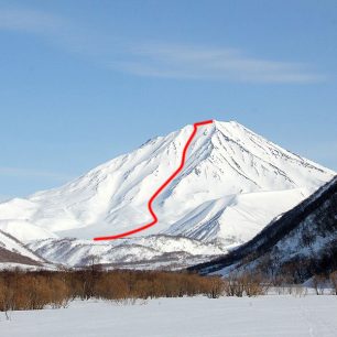 Přes noc se počasí zkazilo, zatáhlo se a začalo foukat. Při šlapání na skialpech k úpatí vulkánu jsme museli 2–3 krát přecházet přes řeku. Někde to šlo po sněhovém mostu, jinde ne. Z dálky to vypadalo, že výstup přímo hlavním svahem z údolí řeky Pravaja Kamčatka nebude z hlediska možného lavinového nebezpečí ideální. Měli jsme za to, že zvolíme raději esovitě pokroucený svah vlevo od hlavního. Poté, co jsme se přes pláně dostali k samotnému vulkánu, jsme se shodli na výstupu hlavním svahem.