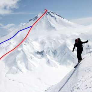 Naštěstí jsme se příbližně ve výšce 1200 m dostali nad mlhu a mraky a nad námi se otevřel krásný výhled na Viljučinskij. O pokračování tak byl rozhodnuto. Někteří dali lyže na batoh ve výšce asi 1350 m, zatímco další pokračovali se stoupacími železy na vázání někde do 1700 m. Na vrcholový hřeben jsme se dostali na stoupacích železech, ale bohužel už v době, kdy se vrchol zahalil do mraků. Na Tichý oceán, ani do údolí Paratunka tak nebylo z vrcholu vidět.