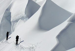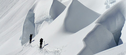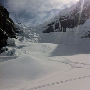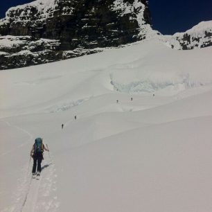 Slunce ovšem nesvítí každý den a pokud má člověk rád prašan, tak to znamená že často sněží, tím pádem viditelnost v alpinském pásmu nad hranicí lesa e je mizerná a navigovat ledovcové trhliny není zrovna žádný med. I když musím říct, že Larry má okolní terén v oku a v totalním whiteoutu nás vyslal na 3150 metrů vysoký Mt. Kemmel a jen z pozadí naší skupiny nás korigoval. Jsme přece aspiranti na lyžařské vůdce a s mlhou se musíme umět poprat! Icefall sedí v Kemmel údolí, kde se sbíhají další tři potoky, a tak nabízí opravdu fantastické pojezdy ve vzrostlých lesích či otevřených úsecích doslova od prahu chaty až dolů do přibližně 1200 metrů. Dá se také přejít přes IcePass do vedlejšího Rostrum Valley a otevřít si tak další minimálně dva dny pojezdů v lese.