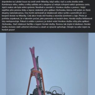 „Byli pouze 40 metrů od orientačních tyčí, přesto se dnes nedaleko Mohyly Hanče a Vrbaty ztratili. Jak ukazuje fotka z místa zásahu Horské služby, příčinou dezorientace byla nulová viditelnost. Prostě nebylo vidět na krok. Skupina 3 dospělých a 3 dětí ve věku 2-7 let byla kolem 11 hodiny dopoledne na Labské louce na cestě směr Mísečky, když sešla z tyčí a zcela ztratila směr. Kombinace větru, sněhu a mlhy udělala své a skupina už nebyla schopná nalézt správnou cestu. Jejich reakce ale byla velmi správná. Neváhali a zavolali si Horskou službu o pomoc. I když nejdříve přes pevnou linku a teprve následně přes aplikaci Záchranka, kterou měl jeden ze členů skupiny nainstalovanou. Dva horští záchranáři je lokalizovali velice rychle a pomohli jim se v bezpečí dostat na Mísečky. Celá akce trvala dvě hodiny a skončila úsměvem u čaje. Přesto je potřeba zopakovat, že v takovém počasí, jako panovalo na horách dnes, Horská služba hřebenové túry nedoporučuje. Pokud si voláte o pomoci, je dobré volat Horskou službu vždy přes aplikaci Záchranka. Stačí stisknout tlačítko s logem Horské služby.“