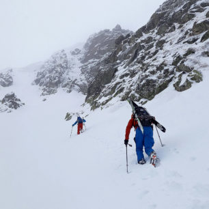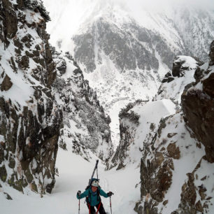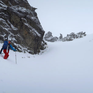 Strmý žľab, do ktorého sa chystáme, traverzuje črieda kamzíkov. Idú po jednom, po dvoch a ladnými skokmi nám ho otestujú. Lyže si dávame na batohy, obúvame mačky, zapíname prilby. Dnes sú chalani za džentlmenov a prešľapávajú stopu. Bude to fuška, snehu je požehnane. Pútka na batohu si nezapínam, ani pútka na paličkách si nedávam na ruky. Ideme v rozostupoch, dávam chalanom náskok.