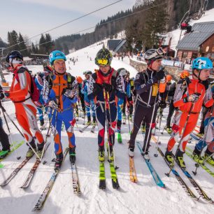 V Rokytnici vše proběhlo celkem v klidu a najednou stojíme na startu ve 13 hodin. Mé obavy z velkého mrazu, kvůli kterému jsem se raději přistrojil, byly zbytečné. Po prvních pár stovek metrů do prudké sjezdovky na Lysou horu jsem se totálně vařil. Krátký, ale nebezpečný úsek sjezdu na pásech a sjetí na černou sjezdovku bylo opravdu výživné. Potom byl hned krpál, kde se dalo jít jen přímo nahoru, jelikož sjezdovka byla fakt prudká. To není zrovna moje parketa a opět Honza Pochobradský ze stejného oddílu jde jak stroj.